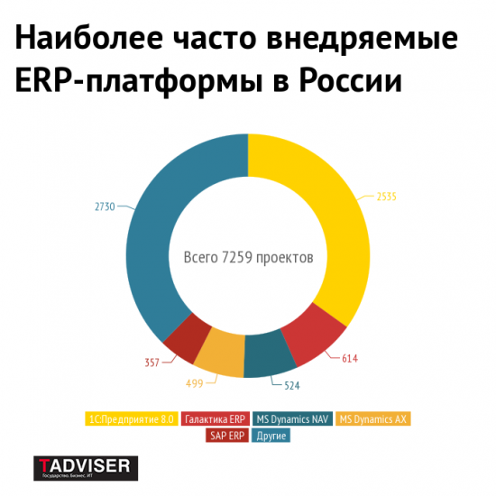 TAdviser, 2014 Что касается доли системных интеграторов, выраженной не в денежном эквиваленте, а в количественном (по числу реализованных ERP-проектов в общем объеме), то здесь абсолютное лидерство принадлежит партнерам-франчайзи компании «1C». В количественном разрезе «1C:Предприятие 8» является, по данным TAdviser, наиболее часто используемой в России ERP-платформой. TAdviser оценивает доли поставщиков на российском рынке ERP-систем не по объему выручки, а по количеству реализованных проектов внедрения, данные о которых размещены в базе Центра TAdviser. Накопленная TAdviser статистика позволяет говорить о частоте использования тех или иных платформ в России. По июль 2014 года за всю историю наблюдений TAdviser наиболее часто внедряемыми платформами можно назвать помимо «1С:Предприятие 8» такие системы как «Галактика ERP», Microsoft Dynamics AX, Microsoft Dynamics NAV и SAP ERP.