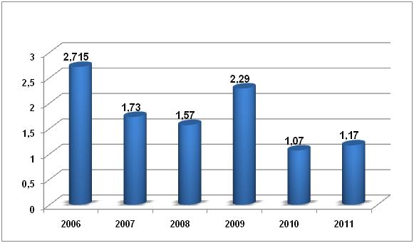 Динамика прироста абонбазы в РФ в мае, по данным AC&M Consulting, млн Уровень проникновения сотовой связи в России к концу мая 2011 года составил 153 %,увеличившись за месяц на 0,8 %. Напомним, что на конец апреля проникновение составляло 152,2 %, а увеличение за месяц – 0,4 %. За год проникновение увеличилось на 6,5 %.