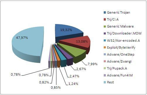 Исходя из данных, полученных благодаря онлайн-сканеру Panda ActiveScan, трояны стали причиной инфицирования в 69% случаев, далее следуют вирусы (10% случаев) и черви (8,53%). Рекламное ПО (adware), которое составило лишь 1,37% от всего обнаруженного вредоносного ПО, привело к 9% заражений – это показывает, какие значительные усилия предпринимают создатели подобного программного обеспечения для его продвижения. Количество поддельных антивирусов, которые также входят в разряд рекламного программного обеспечения, по-прежнему увеличивается.