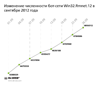 Ботнеты Статистика численности бот-сети Backdoor.Flashback.39, состоящей из инфицированных компьютеров под управлением операционной системы Mac OS X, по-прежнему демонстрирует сокращение числа заражений. Так, в течение сентября численность инфицированных «маков» снизилась еще примерно на 10%, с 127 681 до 115 179, в то время как прирост ботнета практически остановился: сейчас к нему присоединяется не более одного компьютера в сутки. Ознакомиться с более подробной информацией о текущем состоянии бот-сети можно на специальном сайте, созданном специалистами «Доктор Веб». Ботнет, состоящий из рабочих станций, инфицированных файловым вирусом Win32.Rmnet.12, продолжает бить все рекорды. За месяц он вырос еще на 500 000 инфицированных узлов, таким образом, общая численность бот-сети скоро превысит 5 млн. Динамика прироста этой сети показана на представленной ниже иллюстрации.