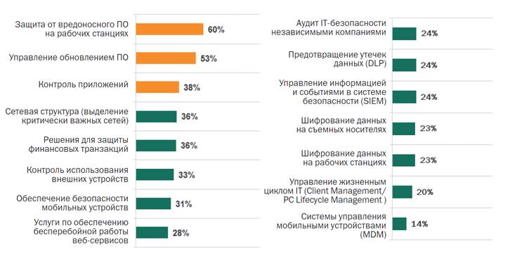 В 2014 году к защите от вредоносного программного обеспечения на рабочих станциях прибегали 60% организаций, на сегодняшний день это наиболее распространенная мера для обеспечения информационной безопасности IT-инфраструктур. Два других основных наиболее востребованных способов защиты — регулярное обновление ПО и установка исправлений (патчей) (53%) и контроль приложений (38%). В исследовании отмечено, что актуальным для себя внедрение систем для защиты финансовых транзакций указали 36% компаний, технологий защиты мобильных устройств — 31% и средств поддержания работоспособности веб-сервисов и защиты от DDoS-атак 28%. Кроме того, почти четверть (24%) респондентов указали в качестве новой меры безопасности применение систем для защиты от утечек данных (Data Leakage Protection, DLP). Данные показатели могут говорить о том, что российские компании откладывают защиту новых элементов инфраструктуры, и по-прежнему недооценивают мобильные угрозы. Если сравнивать с результатами других исследований «Лаборатории Касперского» и B2B International, две трети организаций не предпринимают мер для защиты смартфонов сотрудников. Меньше половины финансовых компаний считают, что им необходимо предпринимать усиленные меры по защите денежных транзакций.
