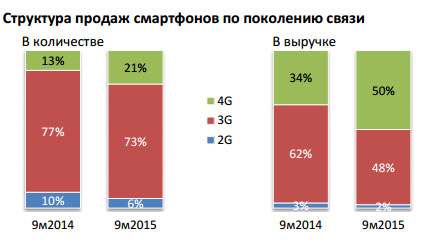 По данным ГК «Евросеть» Все более популярными становятся смартфоны с поддержкой работы в сетях четвертого поколения. Доля таких гаджетов в штуках выросла до 21 %, а в выручке – до 50 %. Смартфонов без поддержки 4G теряют свою долю как в штуках, так и в деньгах.
