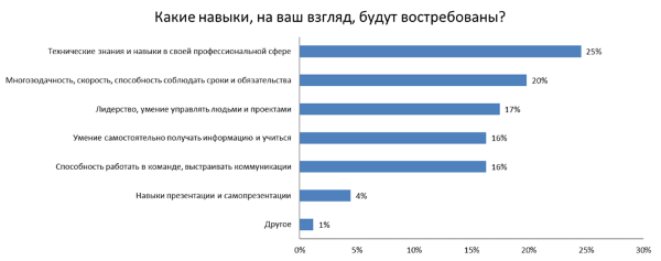 Эксперты Ventra отмечают, что немногим менее трех четвертей респондентов задумываются о поиске себя в другой сфере деятельности: 71% опрошенных интересуется будущим рынка труда именно по этой причине. Четверть опрошенных (24 %) считает ИТ и телеком самым перспективным направлением. На втором месте с довольно существенным отставанием – медицина и фармацевтика (на их долю пришлось 13 % ответов). В топ-3 также вошло производство и продажа товаров народного потребления (9%). Соответственно, именно образование в области ИТ видится респондентам наиболее востребованным: за него проголосовали 25 % опрошенных. 21 % высказались в пользу инженерно-технического образования, а 13% - за медицину и фармацевтику. В числе наиболее востребованных навыков, по мнению респондентов, будут технические знания и навыки в своей профессиональной сфере. Остальные места в топе заняли soft skills: многозадачность, скорость, способность соблюдать сроки и обязательства, лидерство, умение управлять людьми и проектами, умение самостоятельно получать информацию и учиться и т.д. Любопытно видение востребованных в будущем профессий. Лидером стали специалисты по кибербезопасности, вслед за ними идут IT-медики (специалисты по медицинскому оборудованию и технологиям) и digital-маркетологи. В исследовании приняли участие 350+ респондентов из всех федеральных округов России: ЦФО 48%, CЗФО 16%, ПФО 14%, СФО 5%, ЮФО 9%, ДВФО и УФО по 1%, и 4% респондентов, проживающих не в России. Возраст участников опроса: 53% от 30 до 45 лет, так называемое поколение Y, 23% от 45 до 65 лет, поколение X, 23% от 18–30 лет - «миллениалы» - и 1% людей в возрасте 65+, поколение, которое классифицируется, как беби-бумеры. 67% опрошенных работают, 16% не работают и не учатся, 12% учатся и работают, 3% только учатся и 2% ведут собственный бизнес. Автор: Алена Журавлева (info@mskit.ru) Рубрики: Кадры